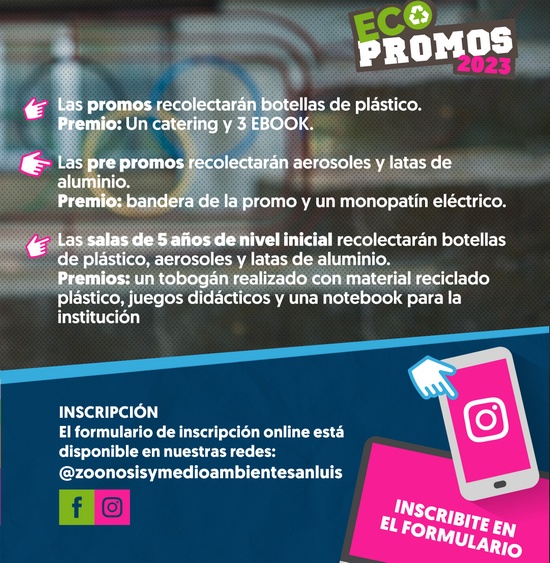 [dropcap style=”circle”]E[/dropcap]co Promos, el concurso dirigido a las promos, prepromos y el último año del nivel inicial, vuelve con una nueva edición 2023. Las instituciones que pertenezcan a estos ciclos lectivos y formen parte del éjido de la Ciudad de San Luis podrán inscribirse desde este 31 de marzo hasta el 27 de septiembre, a través del formulario https://acortar.link/ecopromos-munisanluis. Se deberá ingresar el nombre de la institución y de la promoción en el caso de tenerlo. Las promos del último año de secundario, deberán ingresar la cantidad de estudiantes.