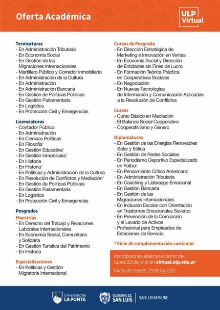 Hace pocas semanas, la ULP presentó su nueva oferta académica, con 49 propuestas educativas entre las que hay licenciaturas, tecnicaturas, posgrados, cursos y diplomaturas, con títulos de alcance nacional y que se dictarán de forma gratuita y online. Las preinscripciones se pueden hacer a través del sitio http://virtual.ulp.edu.ar/